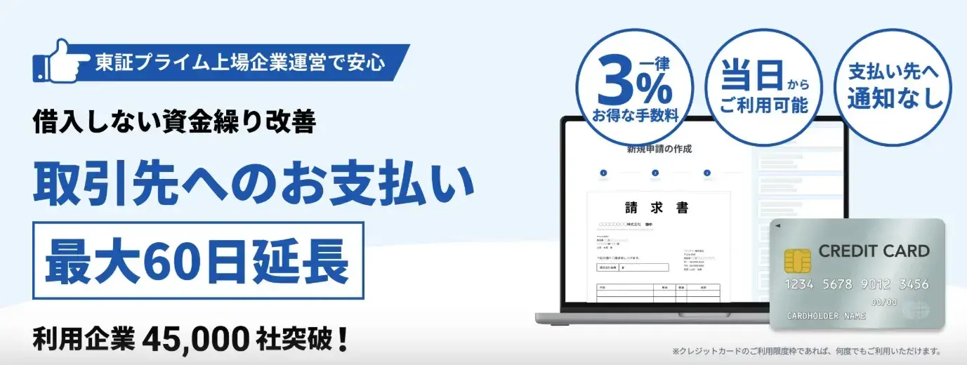 クレジットカードを利用するため、ポイントやマイルが貯まりやすいのも魅力です。さらに、カード明細で支払い履歴を一元管理できるため、複数の請求先の支払いをまとめて把握でき、経理作業の負担軽減にもつながります。